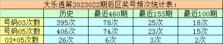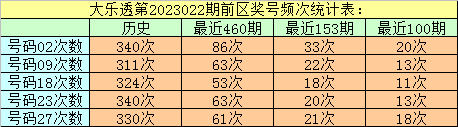 万妙仙大乐透第2023022期前区热号分析:(统计最近460期数据)