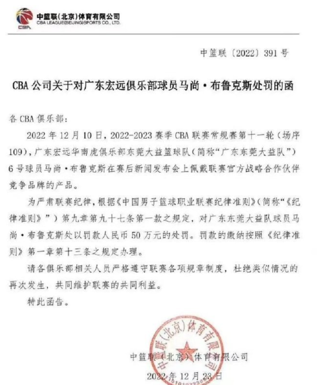 北京期间12月24日,CBA官方晓示,广东外助马尚-布鲁克斯因在赛后发布会上带领竞品居品被罚金50万元。