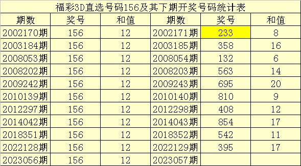 一、开奖追想:第2023056期福彩3D奖号为156。奖号奇偶比为2:1,和值为:12,跨度为:5。