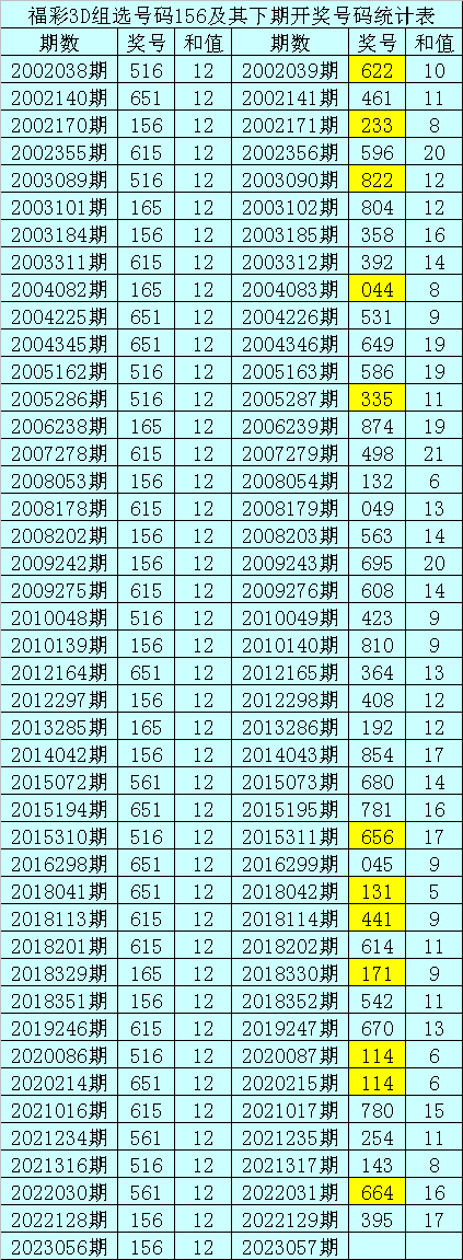 二、组选分析:历史上组选号码156开出了44次,其下期奖号分歧为:622-461-233-596-822-804-358-392-044-531-649-586-335-874-498-132-049-563-695-608-423-810-364-408-192-854-680-781-656-045-131-441-614-171-542-670-114-114-780-254-143-664-395,其开出期数和下期奖号统计为: