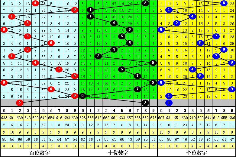 百位分析:该位上期奖号为9,出现0路、奇数、大号,在前11期奖号,该位012路比为8:3:0,2路号码断档,现在012路号码遗漏期数分离为0、4和16,近期百位宝贵2路号码走热。
